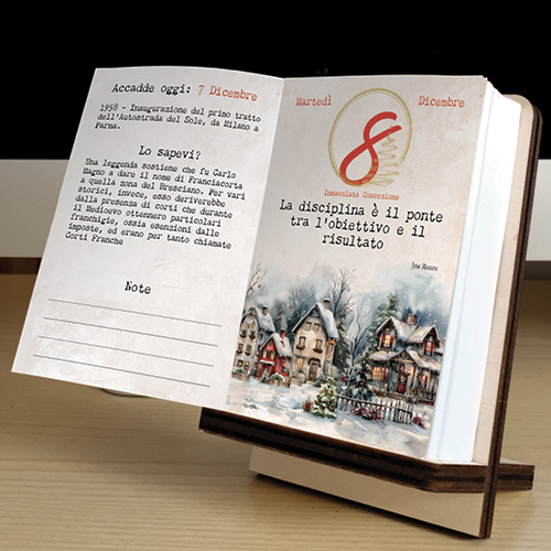 Calendario 2026 nel formato 10×14 cm con supporto in legno di pioppo.